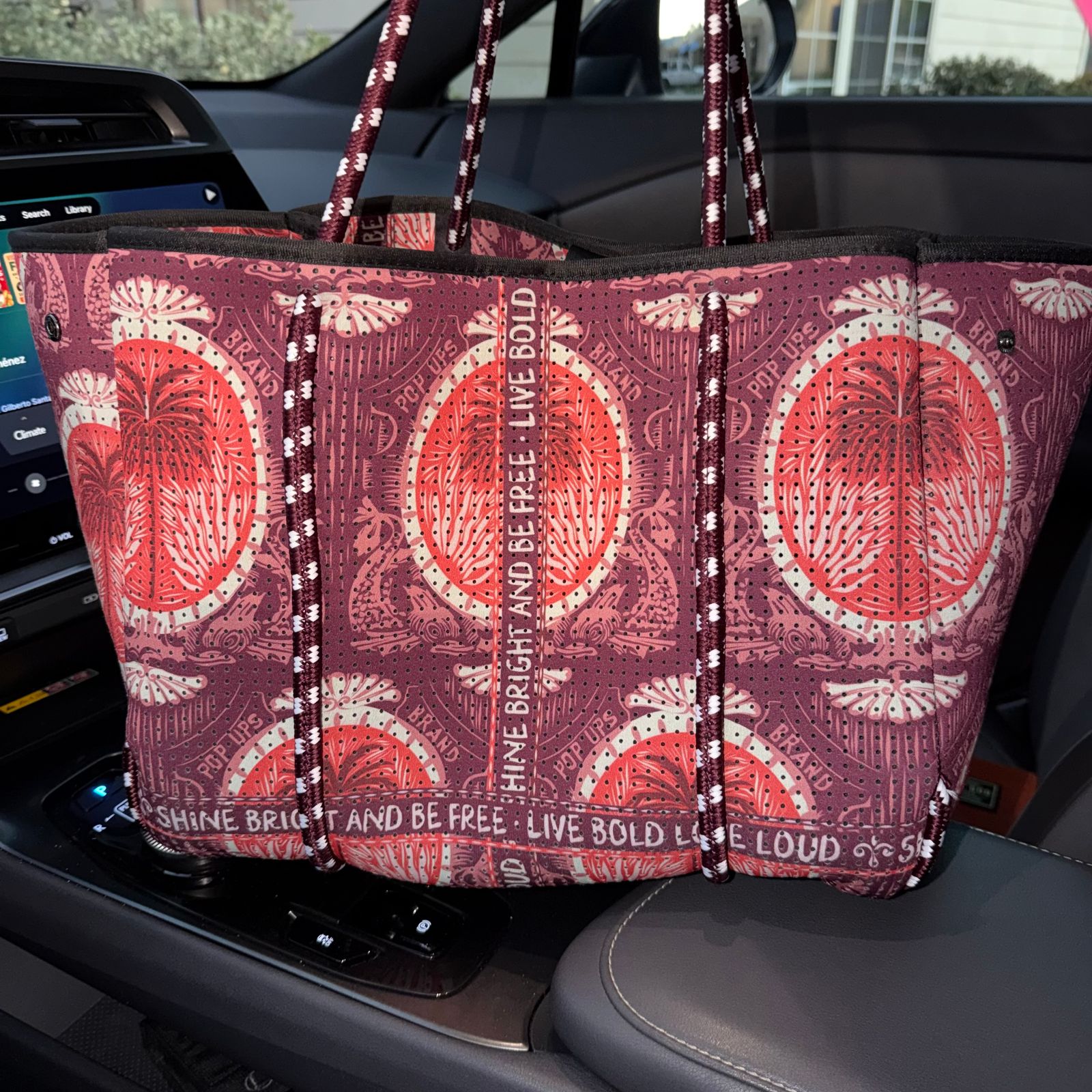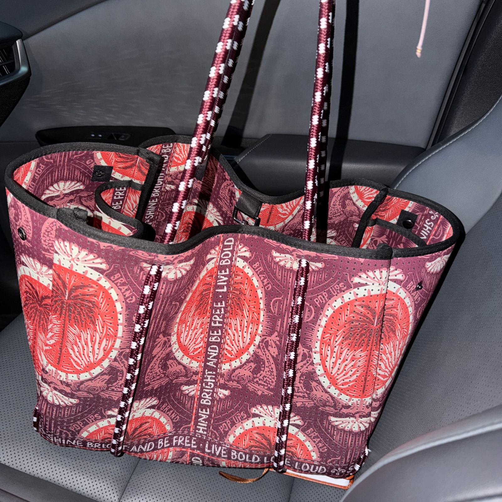 • Confeccionado con nuestro tejido de neopreno perforado 100 % de lujo y asas suaves de cuerda de navegación para llevarlo cómodamente en el brazo o en el hombro.