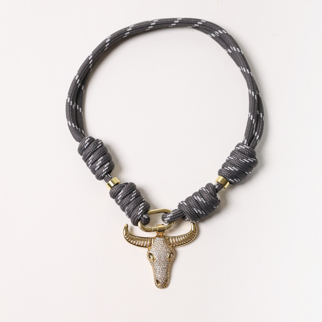 Simple and sleek, this grey rope features the iconic Bull charm believed to bring luck and protection. Chic while making a statement.