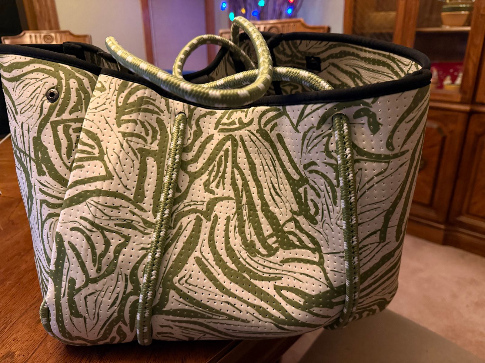 I debated over getting a Popups Tote for a while, I kept seeing all the cute video's and it kept calling my name. I am SO glad I talked myself & my hubby into getting it, I have a closet full of totes, but that didn't stop me! I decided I had to get the beautiful, green Serengeti pattern. Green is my favorite color and this pattern kept me drooling, it really is a beauty & pure happiness to me! I love large totes but they need to be lightweight for my shoulder not to get cranky carrying one. This gem is lightweight and I appreciate the pockets on both ends and the neoprene is so sturdy and a really fun change pace of fabric I added to my tote collection. This bag will make you SO happy, thank you Popups for your cute video's and making these! The neoprene scent does fade over a week or two as they said it would, so don't let that deter you. Join the Popups family, you will be glad you did!