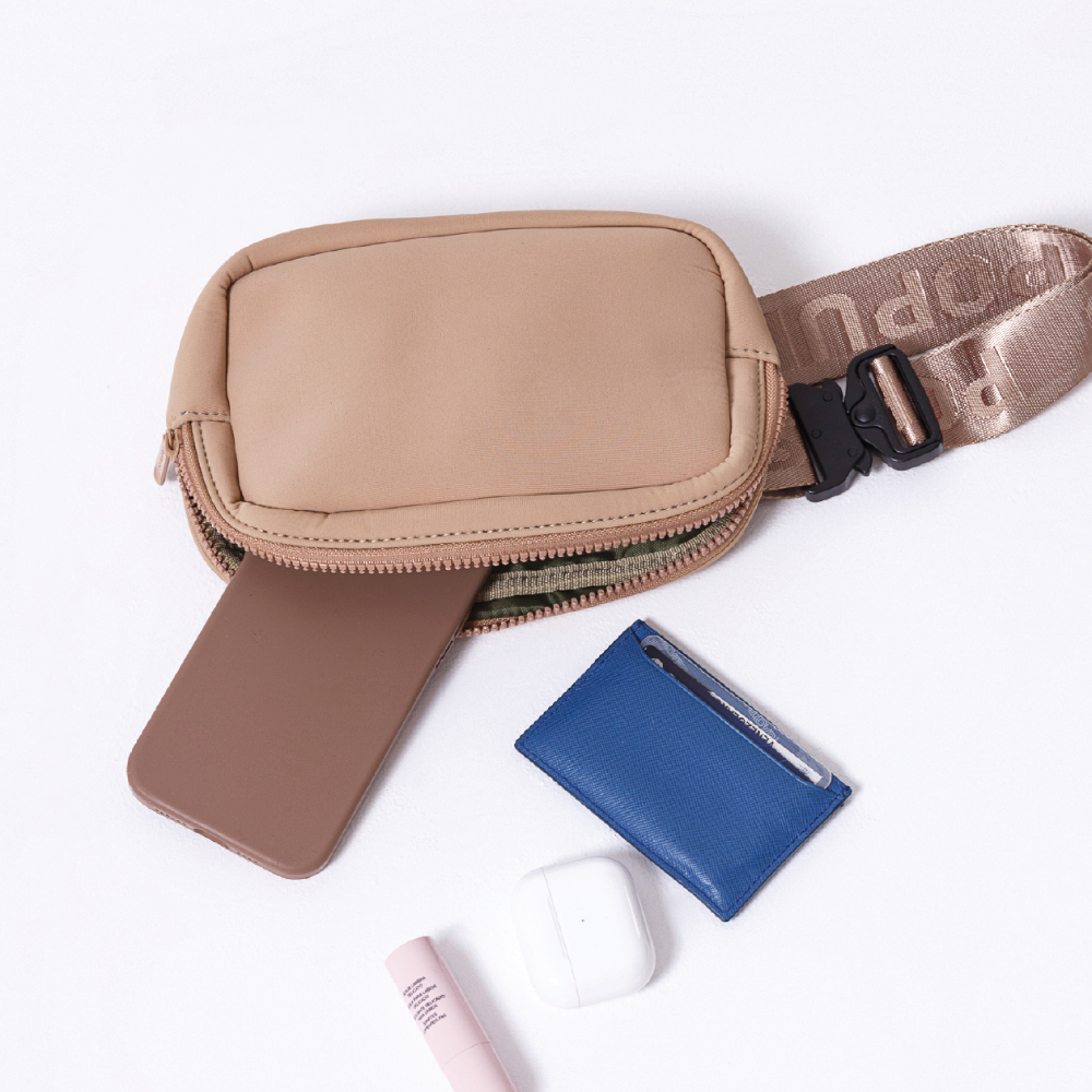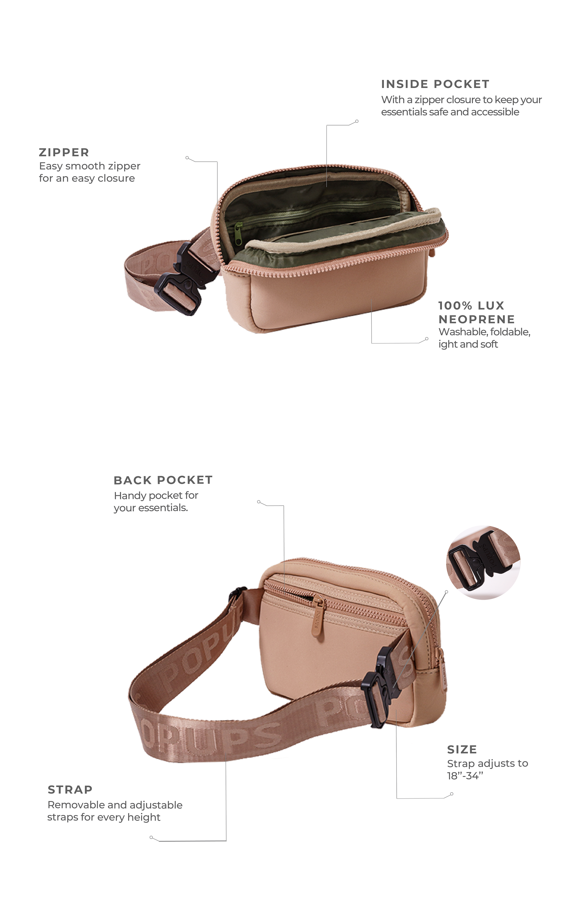 The Everyday Fanny Pack: the perfect hands-free, on the go essential. With zip pockets inside and out, a mesh compartment, an adjustable waist strap for easy fastening or shoulder wear, and sleek neoprene material that makes it machine washable, this fanny pack is a closet staple. Stay organized, hands-free, and ready for anything with this stylish fanny pack.