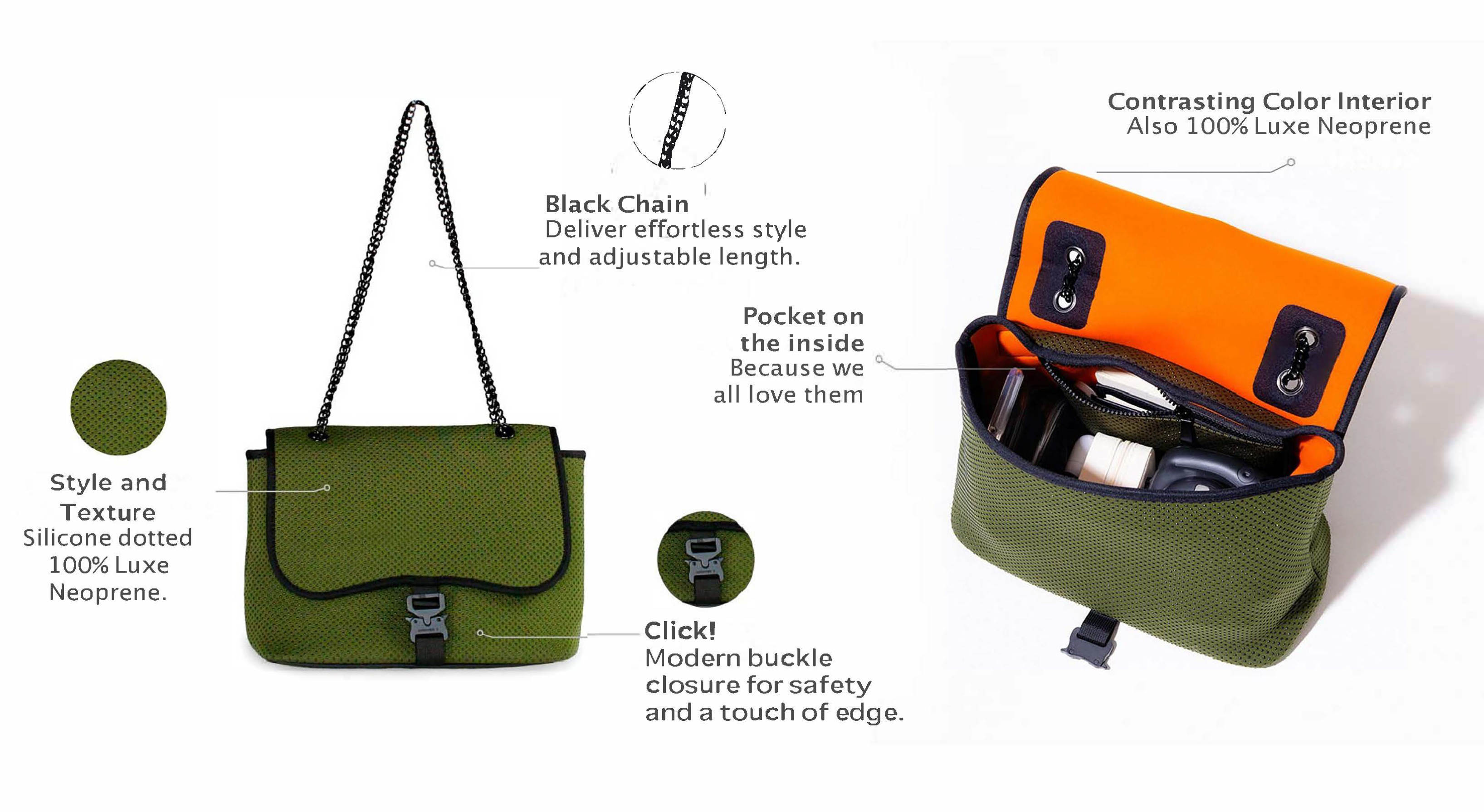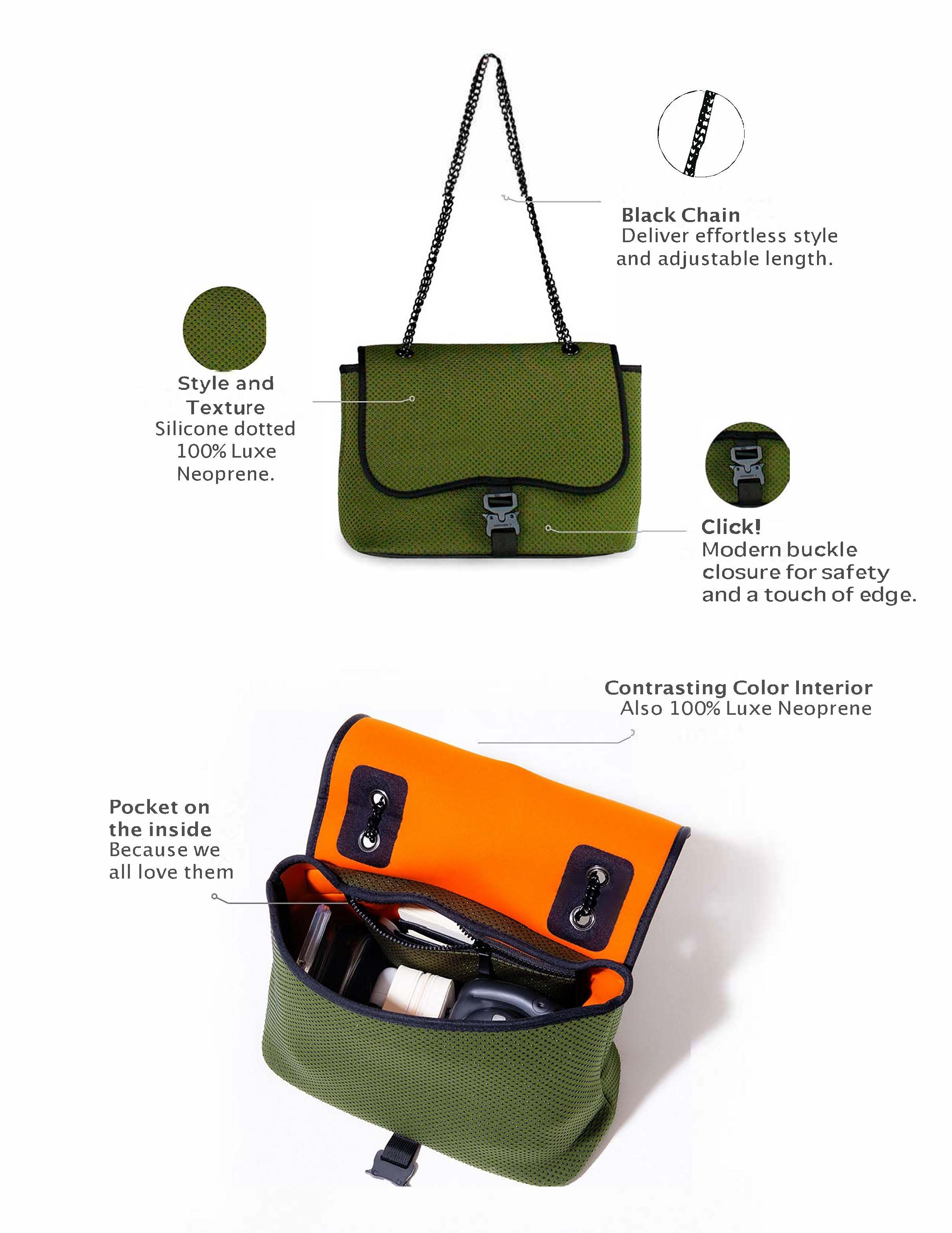 A medium-sized bag with a cool click buckle and a stylish (and adjustable) chain handle that can be worn as a crossbody or over the shoulder.