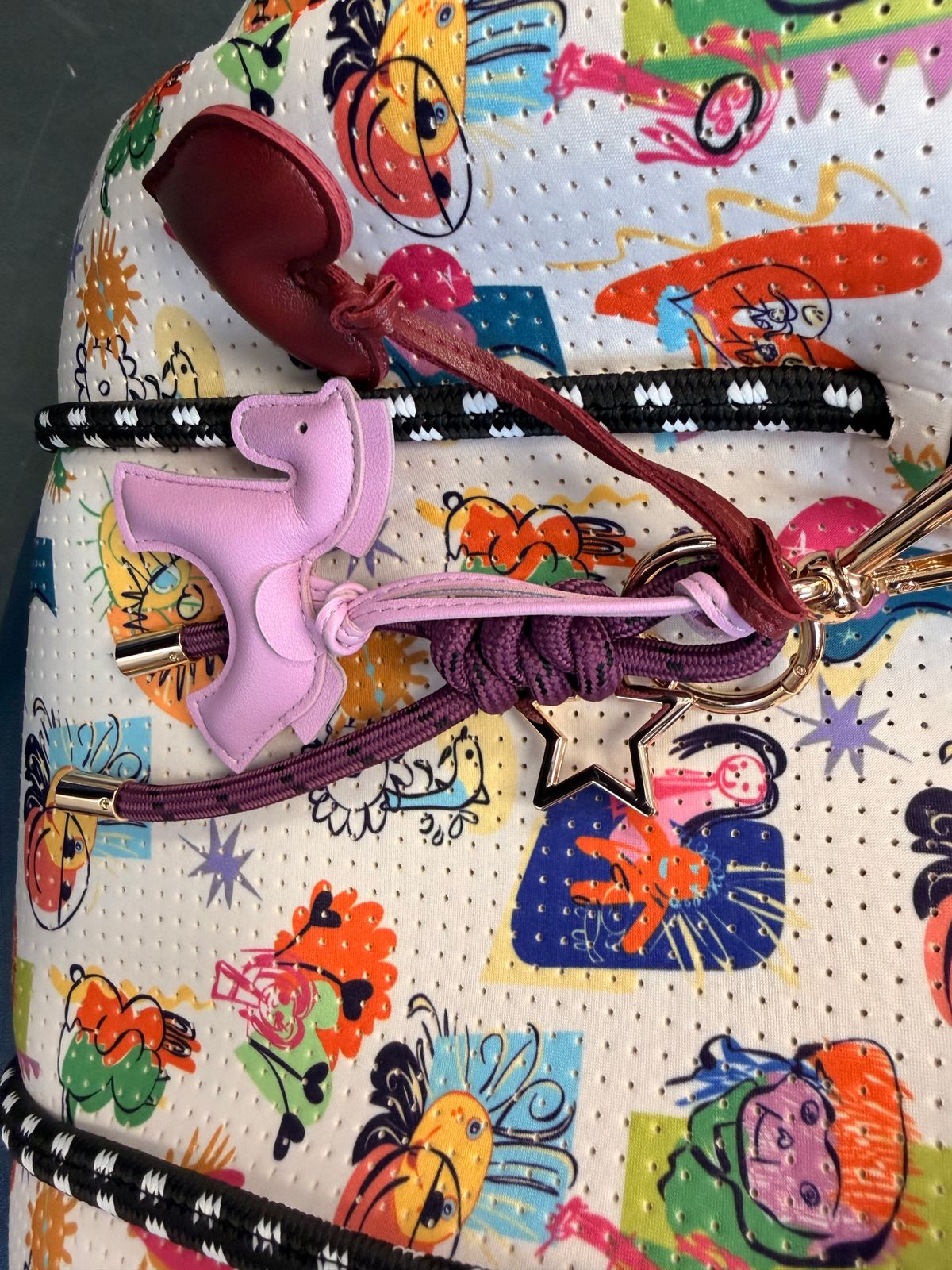 Boat rope keychain adorned with burgundy heart and lavender horse pendants—a perfect accessory to complement your PopUps tote bag!