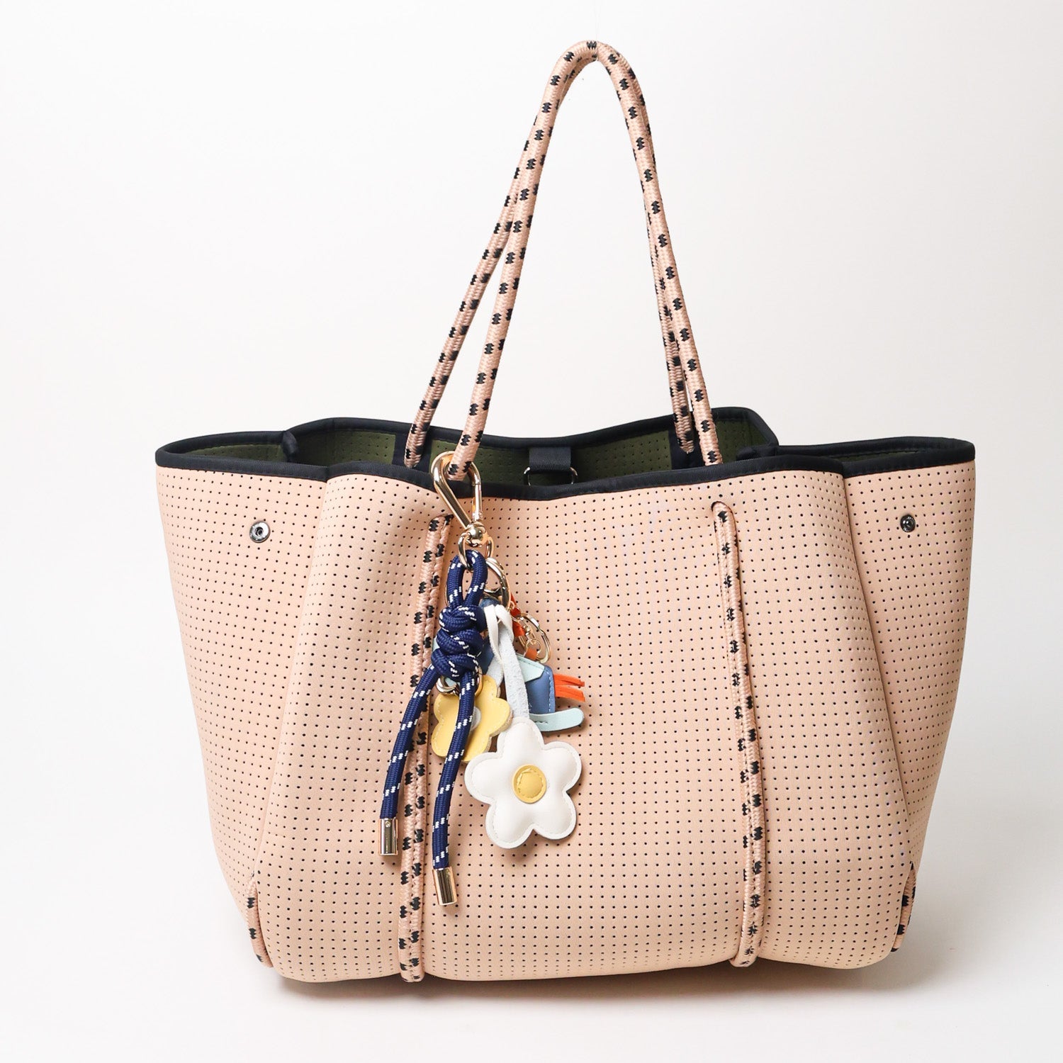 Boat rope keychain adorned with yellow daisies and blue rocking horse pendants—a perfect accessory to complement your PopUps tote bag!