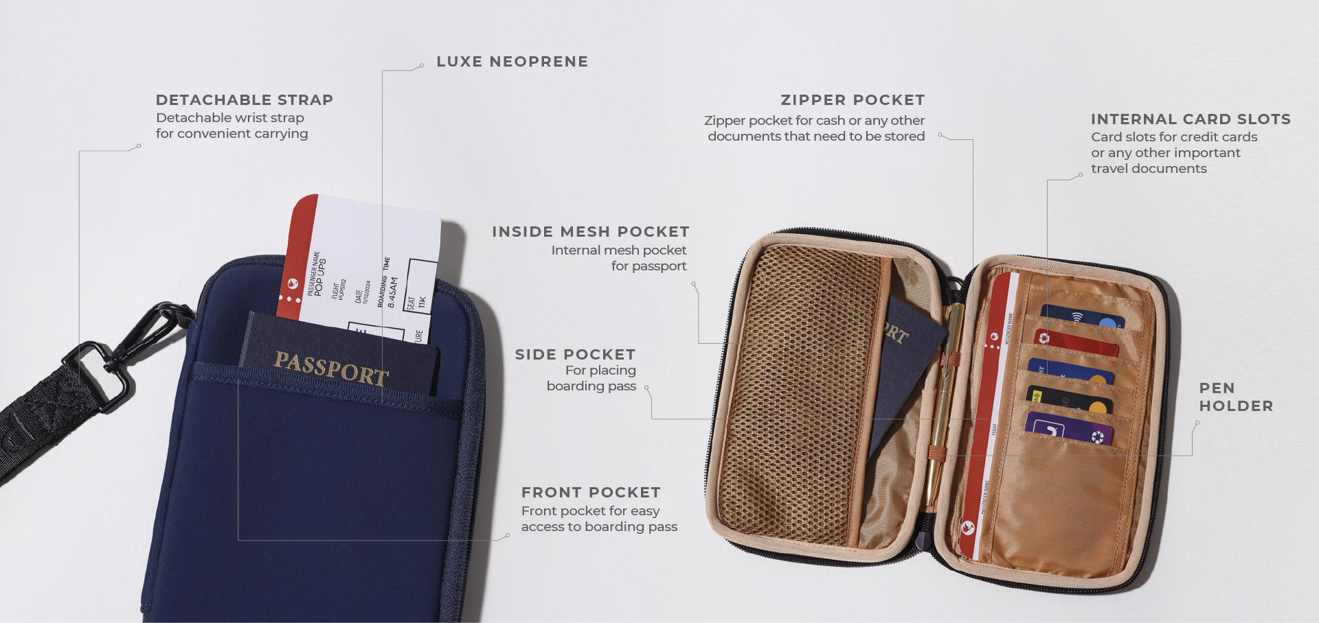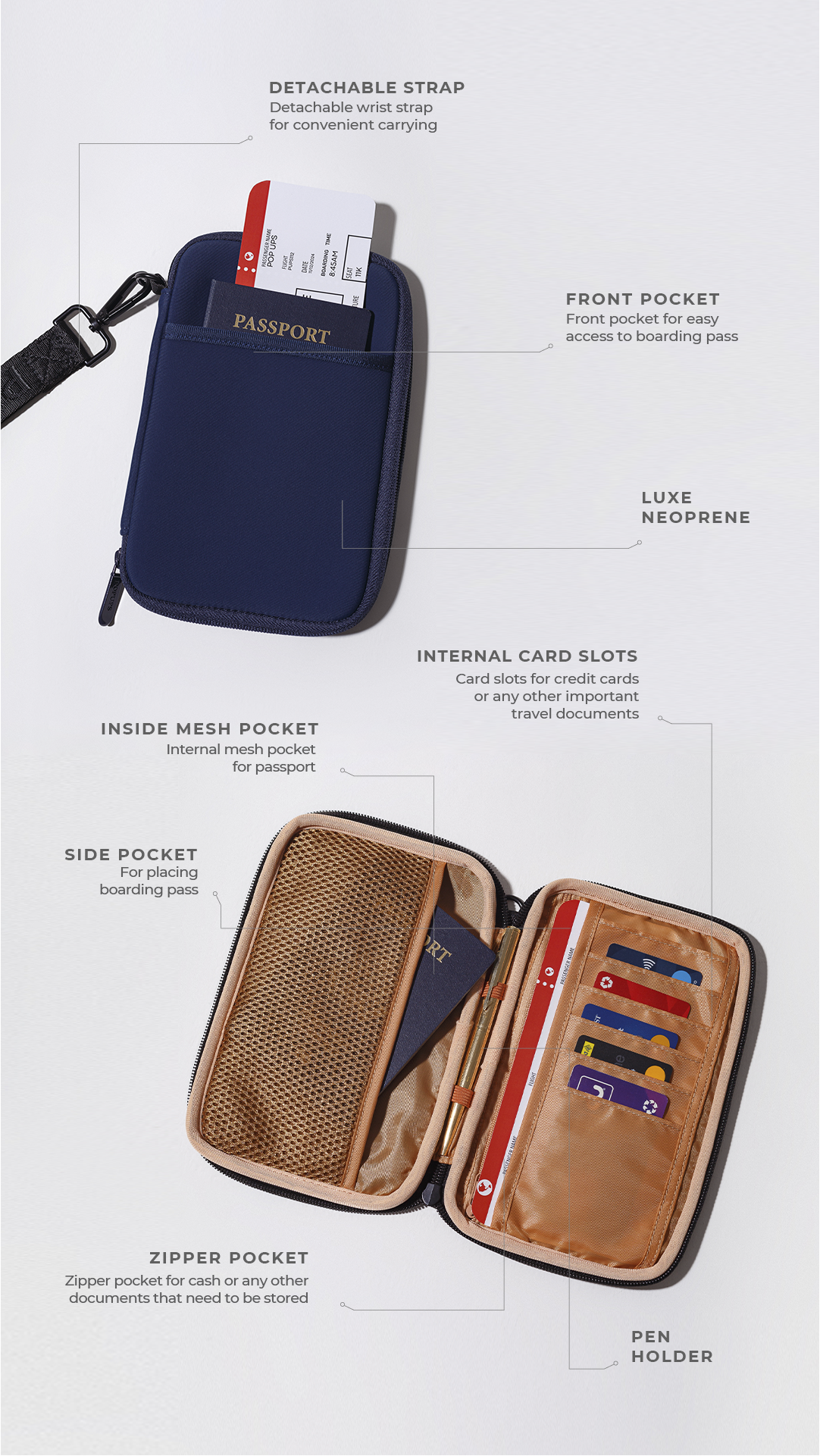 Introducing our versatile Passport Wallet with Wristlet, the ultimate travel companion designed to streamline your journey. Take organization to the next level. Crafted with both style and functionality in mind, this sleek wallet features a convenient wristlet strap for easy carrying and a secure zipper closure to keep your essentials safe. With an exterior compartment for quick access to boarding passes or your smartphone, and an array of interior pockets and card slots, it's the perfect organizer for your passport, credit cards, IDs, and travel documents. Compact yet spacious, this wallet is ideal for both short trips and extended adventures. Elevate your travel experience with our premium-quality passport wallet.