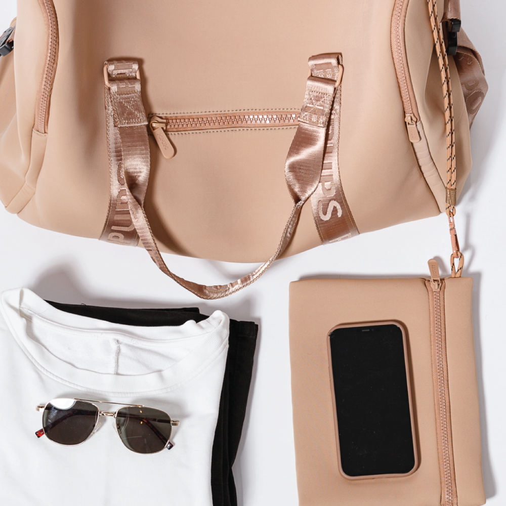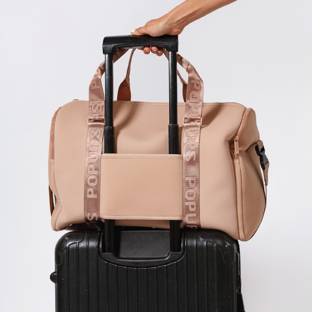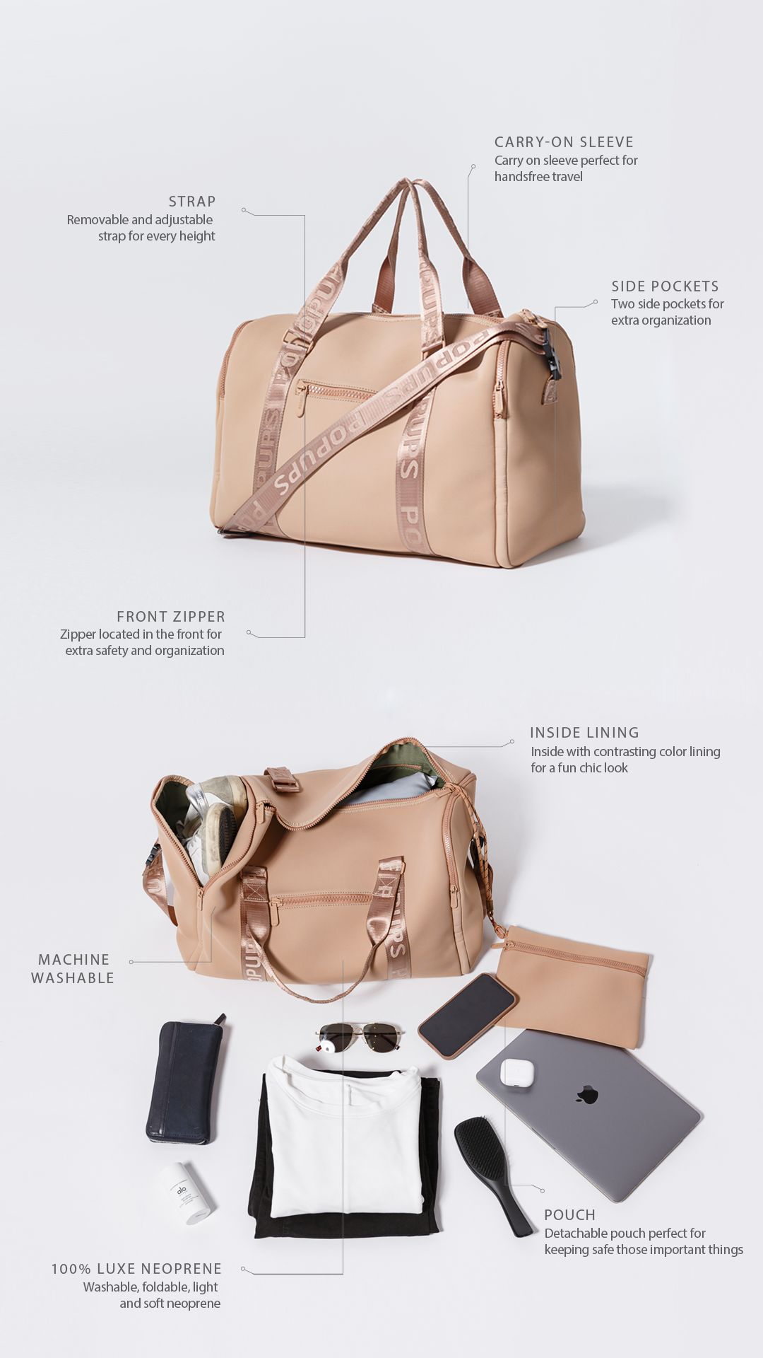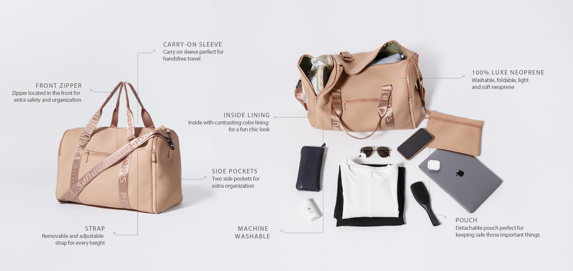 Introducing our Weekender bag, your ideal companion for stress-free packing on any getaway. Crafted with a water-resistant, 100% neoprene, this lightweight bag features an easy-access opening zipper and two side pockets for shoes or other essentials. The signature carry on sleeve effortlessly slides onto any suitcase, while a removable pouch, mesh pocket, and multiple interior pockets ensure optimal organization. Bonus points: the back zipper pocket is perfect for extra storage and the 19-inch strap—perfect for a comfortable crossbody carry. Elevate your packing experience with this stylish and functional essential.
